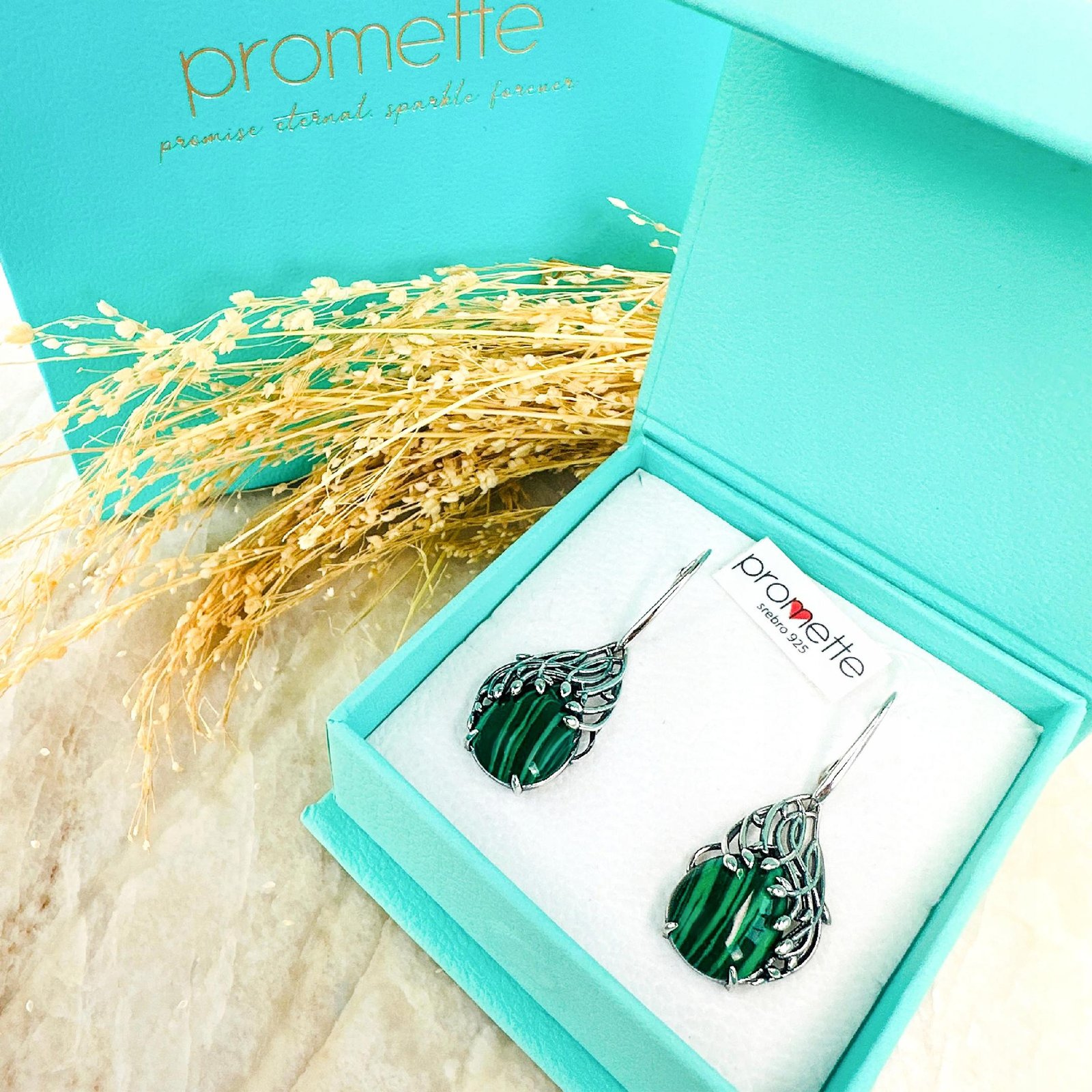 Oszczędź czas i kup gotowy do wręczenia prezent - nasze kolczyki z malachitem zapakowane są w eleganckie pudełko oraz torebkę prezentową, która dodatkowo nadaje im luksusowego charakteru.